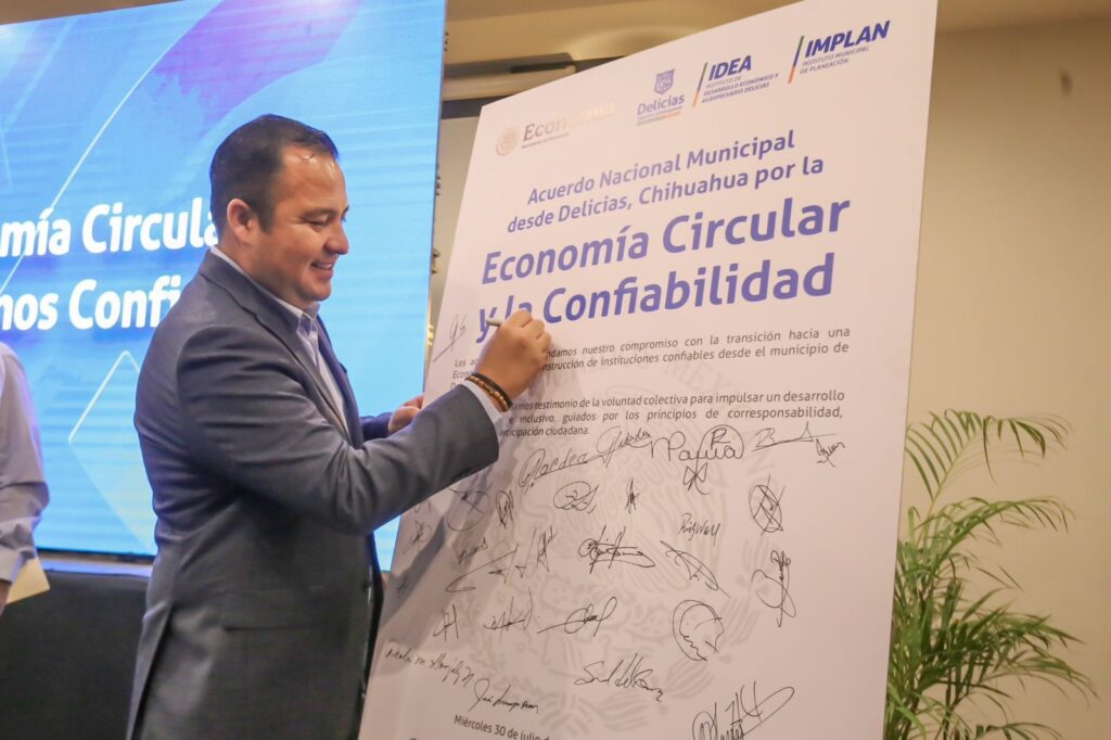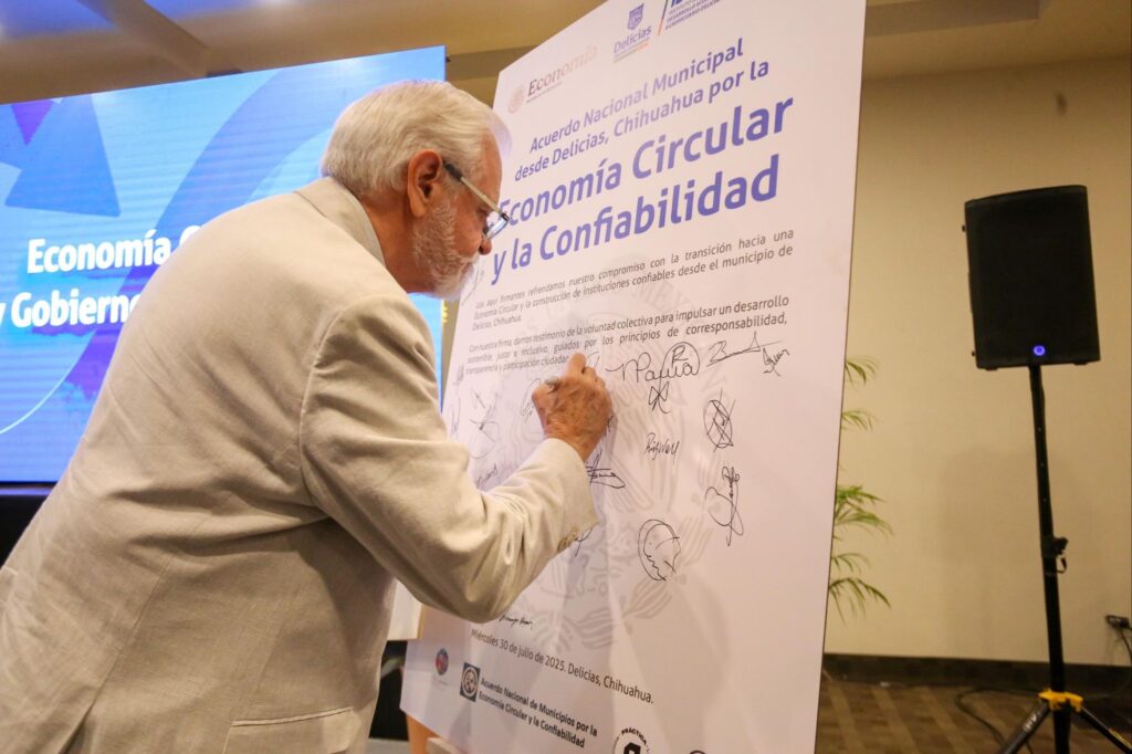 Con la presencia de alcaldes de la región centro-sur, secretarios de Estado, líderes empresariales, autoridades educativas e investigadores, este miércoles se llevó a cabo en Delicias la firma del Acuerdo Local por la Economía Circular y la Confiabilidad, posicionando al municipio como punta de lanza en políticas sostenibles. El acto estuvo encabezado por el presidente municipal Jesús Valenciano García y el doctor Carlos Gadsden Carrasco, presidente de la Fundación para el Desarrollo de Gobiernos Confiables.