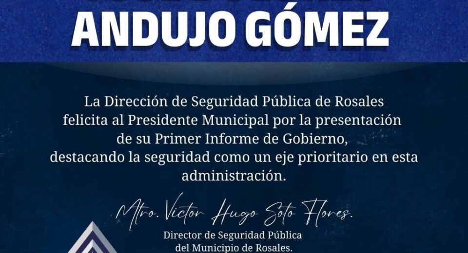 El Mtro. Víctor Hugo Soto Flores, Director de Seguridad Pública Municipal de Rosales, hace extensiva una felicitación al Presidente Municipal, José Dolores Andujo Gómez, con motivo de la presentación de su Primer Informe de Gobierno. Al respecto, el Director de Seguridad Pública expresó: “Este trabajo ha permitido consolidar importantes avances en materia de seguridad, prevención […]