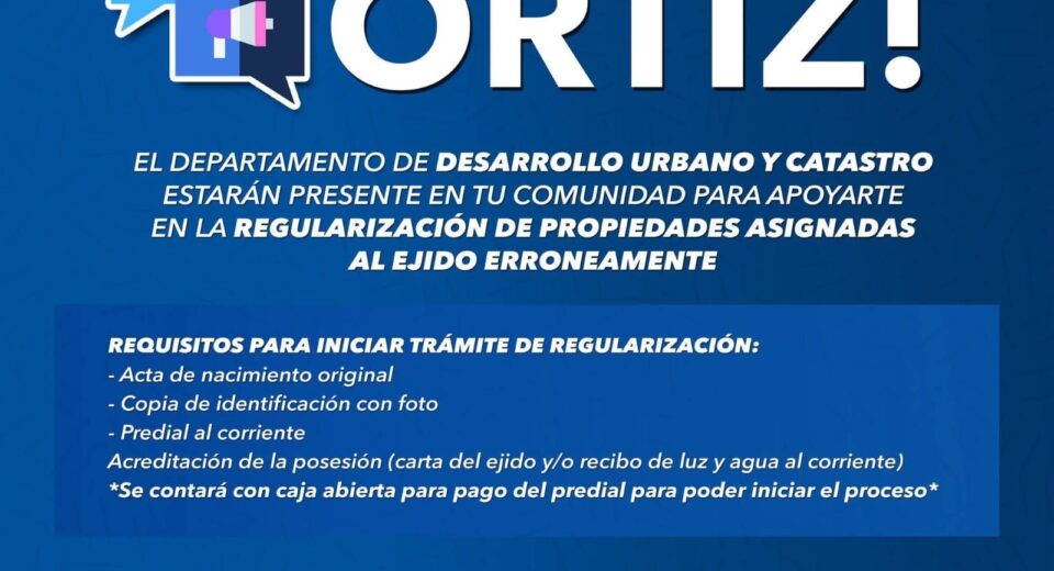 Este sábado 28 de septiembre, el Departamento de Desarrollo Urbano y Catastro estará en tu comunidad para apoyarte en la regularización de propiedades asignadas erróneamente al ejido y aquellas que cuentan únicamente con copia del título de propiedad. 📍 Lugar: Salón Ejidal, Congregación Ortiz⏰ Horario: De 9:00 a 14:00 horas 👥 ¡No dejes pasar esta […]
