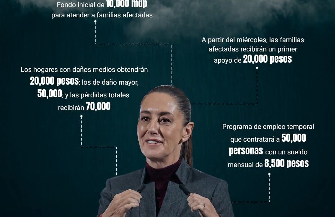 El gobierno federal a cargo de la presidenta Claudia Sheinbaum anunció un fondo inicial de 10,000 millones de pesos para atender a las familias afectadas por los recientes desastres naturales en varios estados del país.