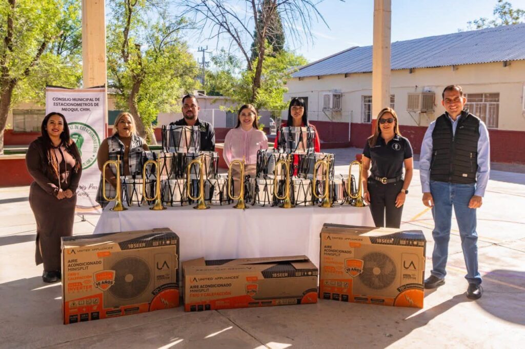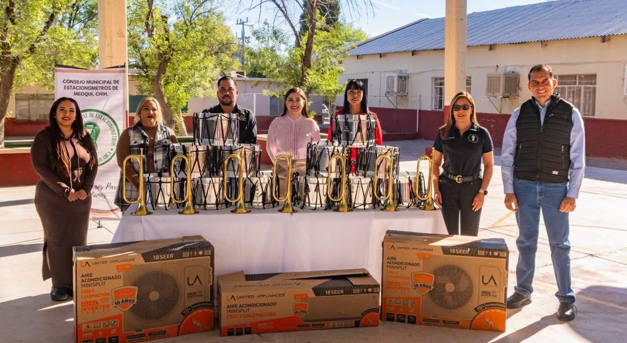 Desde Estacionometros Meoqui entregamos un equipo de 12 tambores, 12 trompetas y 2 mini split para que los niños y niñas de la Escuela 5 de Febrero de Estación Consuelo puedan tener su banda de guerra que da identidad y refuerza sus valores.