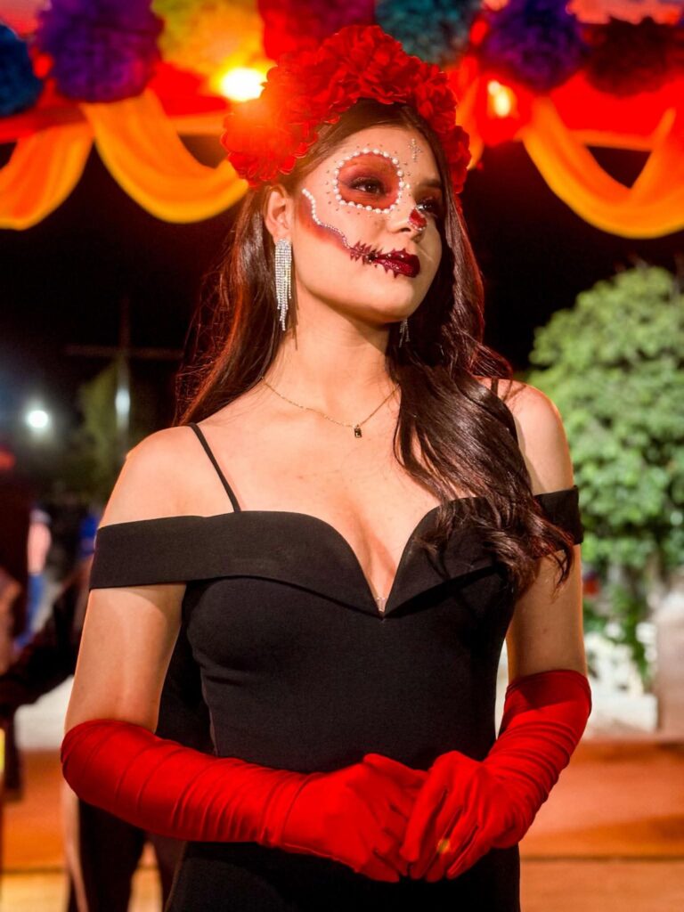 Nuestra Reina de Rosales, Lesly Gómez, lució espectacular representando a una Catrina llena de elegancia y orgullo mexicano, en el marco de la celebración del Día de Muertos 💀🌼