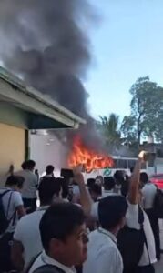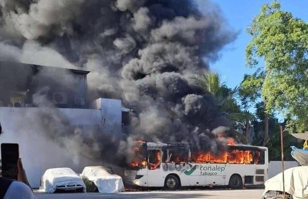 Villahermosa #Tabasco Alumnos incendiaron un autobús escolar para exigir el pago de becas atrasadas en el plantel del Fraccionamiento Insurgentes en Villahermosa.
