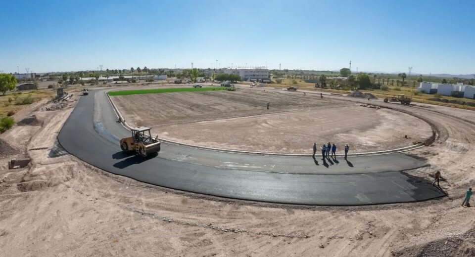 Avanza colocación de carpeta asfáltica en pista de atletismo en Delicias