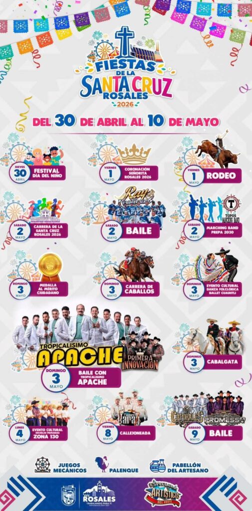 Lo anterior, para gozar a lo grande las Fiestas Patronales de la Santa Cruz en Rosales 2026, todas y todos invitados.